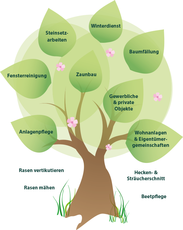 Mit Leistungen wie Garten- & Grundtückspflege, Fensterreinigungen inklusive Rahmen, Grundreinigung von Haus und Wohnung, Frühjahrsputz sowie Winterdienst (auch für den Privathaushalt) für Eigentümergemeinschaften, Wohnanlagen sowie Alten- & Pflegeheime stehen wir Ihnen mit Rat und Tat zur Seite.